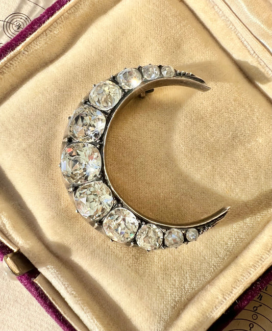 ANTIQUE • Victorian Sterling Silver w/ Cushion Cut Diamond Paste Crescent Brooch
