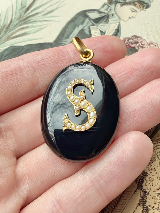 ANTIQUE • Victorian 14k Yellow Gold w/ Onyx & Seed Pearls “S” Initial Locket Pendant