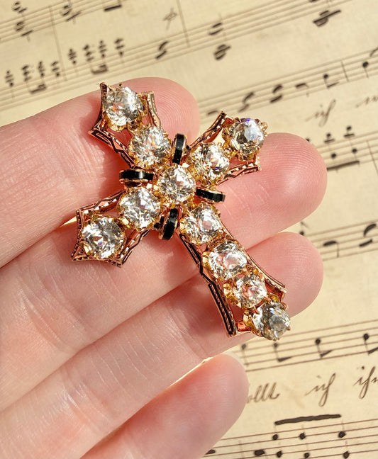 ANTIQUE • Victorian 10/14k Yellow Gold w/ Old Mine Cushion Cut Paste Diamonds & Enamel Cross Pendant Brooch