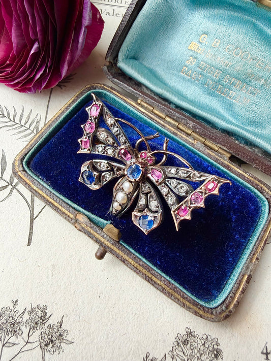ANTIQUE • Victorian 14k Silver-Topped Yellow Gold Butterfly w/ Blue & Pink Sapphires, Diamonds & Sea Pearls Brooch Pendant