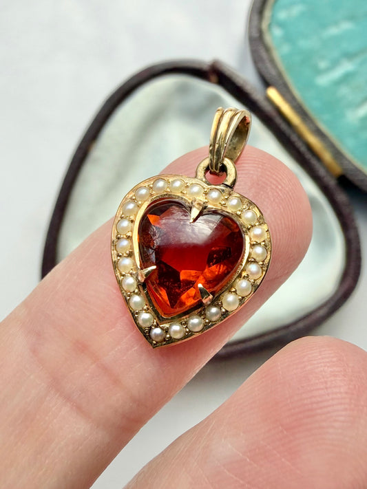ANTIQUE • Art Nouveau 14k Yellow Gold Madeira Citrine w/ Seed Pearls Heart Charm Pendant