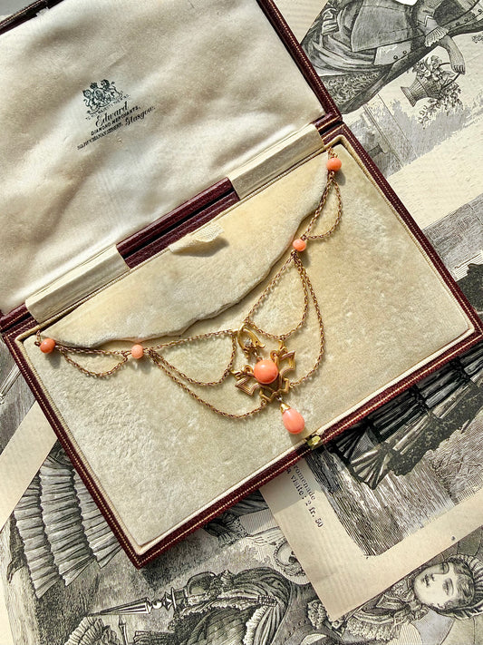 ANTIQUE • Art Nouveau 14k Yellow Gold w/ Natural Coral & Diamond Festoon Necklace