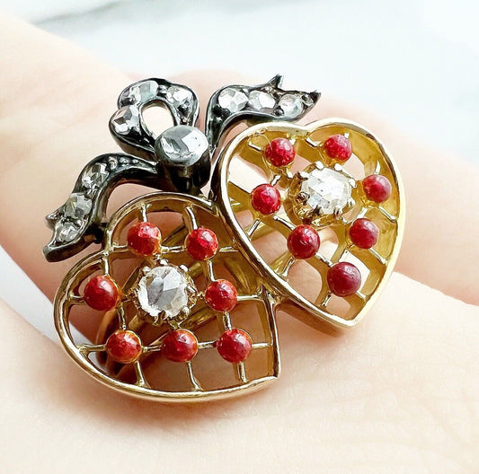 ANTIQUE • Victorian 14k Yellow Gold Rose Cut Diamond Double Heart Ring w/ Bow & Enamel