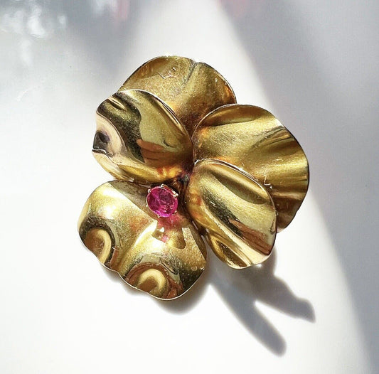 ANTIQUE • Victorian 14k Yellow Gold Pansy Brooch w/ Old Cushion Cut Ruby Center