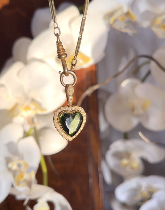 ANTIQUE • Victorian 9k Yellow Gold w/ Peridot Paste Heart & Pearl Halo Pendant