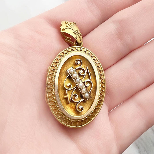 ANTIQUE • Victorian Etruscan Style 18k Yellow Gold w/ Seed Pearls Locket Pendant