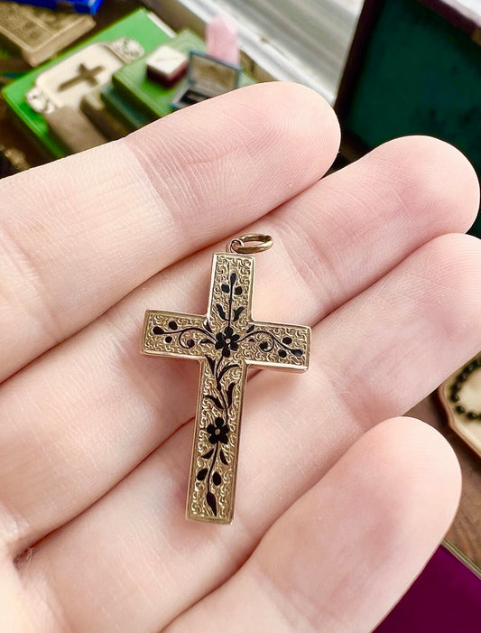 ANTIQUE • Victorian 10k Yellow Gold Taille D’Epargne Enamel Cross Pendant Charm