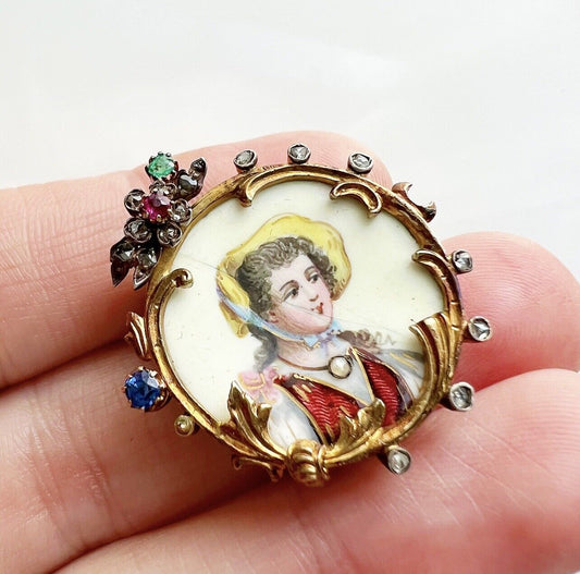 ANTIQUE • Victorian 14k Gold & Silver Gem-Set Framed Enamel Portrait Brooch