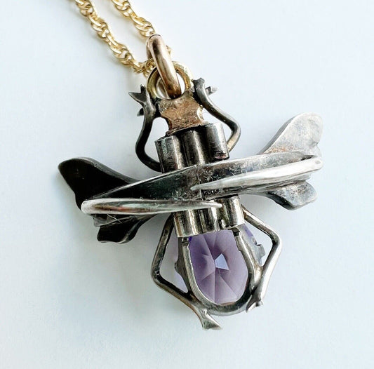 ANTIQUE • Victorian 14k Gold & Silver Amethyst Paste w/ Garnet Fly Pendant