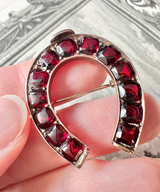 ANTIQUE • Victorian Low Karat Rosy Gold w/ Faceted Garnets Horseshoe Brooch