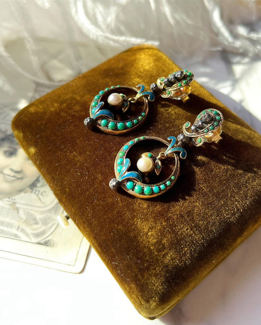 ANTIQUE • Victorian 15ct Dangle Earrings w/ Persian Turquoise, Diamond & Pearl