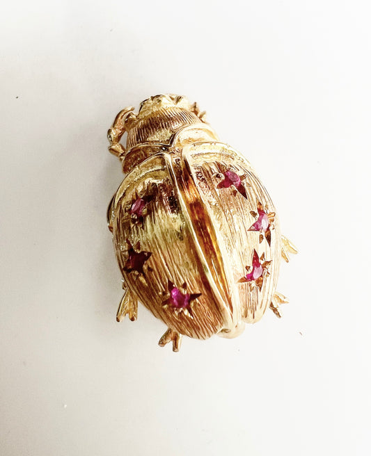 VINTAGE • Retro 14k Yellow Gold Gem-Set Scarab Beetle w/ Natural Rubies Brooch Pin