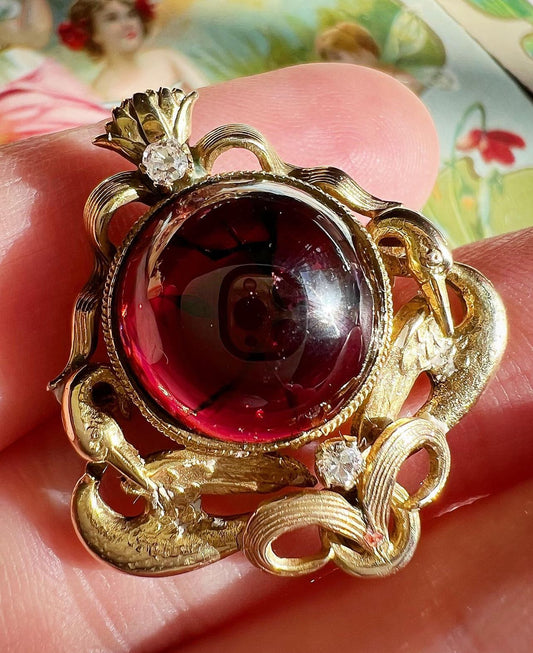 ANTIQUE • Art Nouveau 14k Yellow Gold Gold Flora & Fauna w/ Garnet Carbuncle Cabochon Brooch