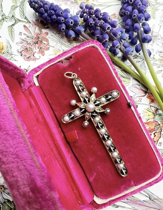 ANTIQUE • Victorian 14k Yellow Gold Table-Cut Natural Ruby Cross Pendant
