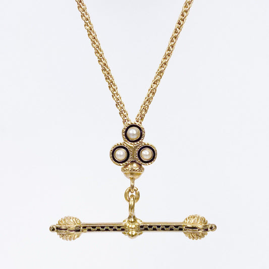 ANTIQUE • Victorian 14k Gold Taille d’Epargne Enamel Clover w/ Pearl Slide Chain & T-Bar Necklace