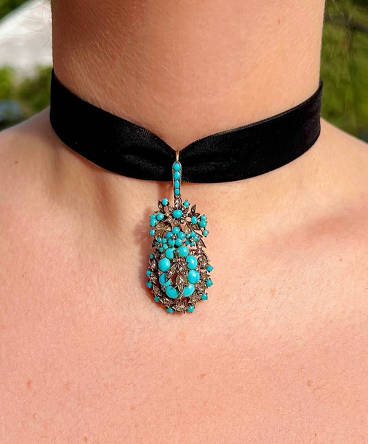 ANTIQUE • Victorian 14k Silver-Topped Gold Persian Turquoise & Rose Cut Diamond Pendant/Brooch