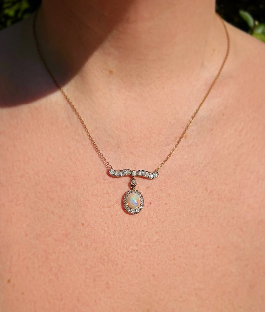 ANTIQUE • Victorian 14k Silver-Topped Gold Old Mine Cut Diamond & Opal Necklace