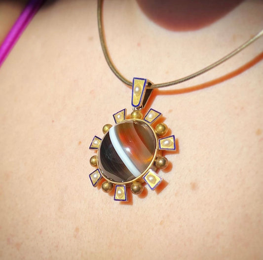 ANTIQUE • Victorian 14k Yellow Gold Banded Agate w/ Sea Pearls & Enamel Pendant