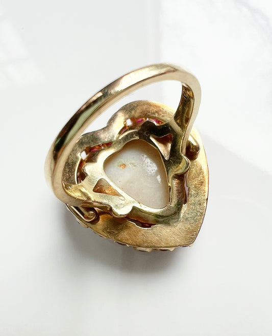 ANTIQUE • Victorian 14k Yellow Gold Australian Opal Heart & Ruby Halo Ring Sz. 6.5