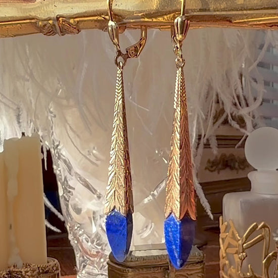 These antique early Art Deco Lapis Lazuli Drop Earrings are crafted from warm 14k yellow gold and expertly engraved with feather motif detailing all the way down the elongated square cone-shaped drops. Set with hand-carved square beveled bullets of Lapis Lazuli in the most vibrant hues of blue with subtle flecks of bright gold pyrite through the matrix. Finished with secure hinge-backed ear wire hooks adorned with a small but elegant little petal design on the front.
