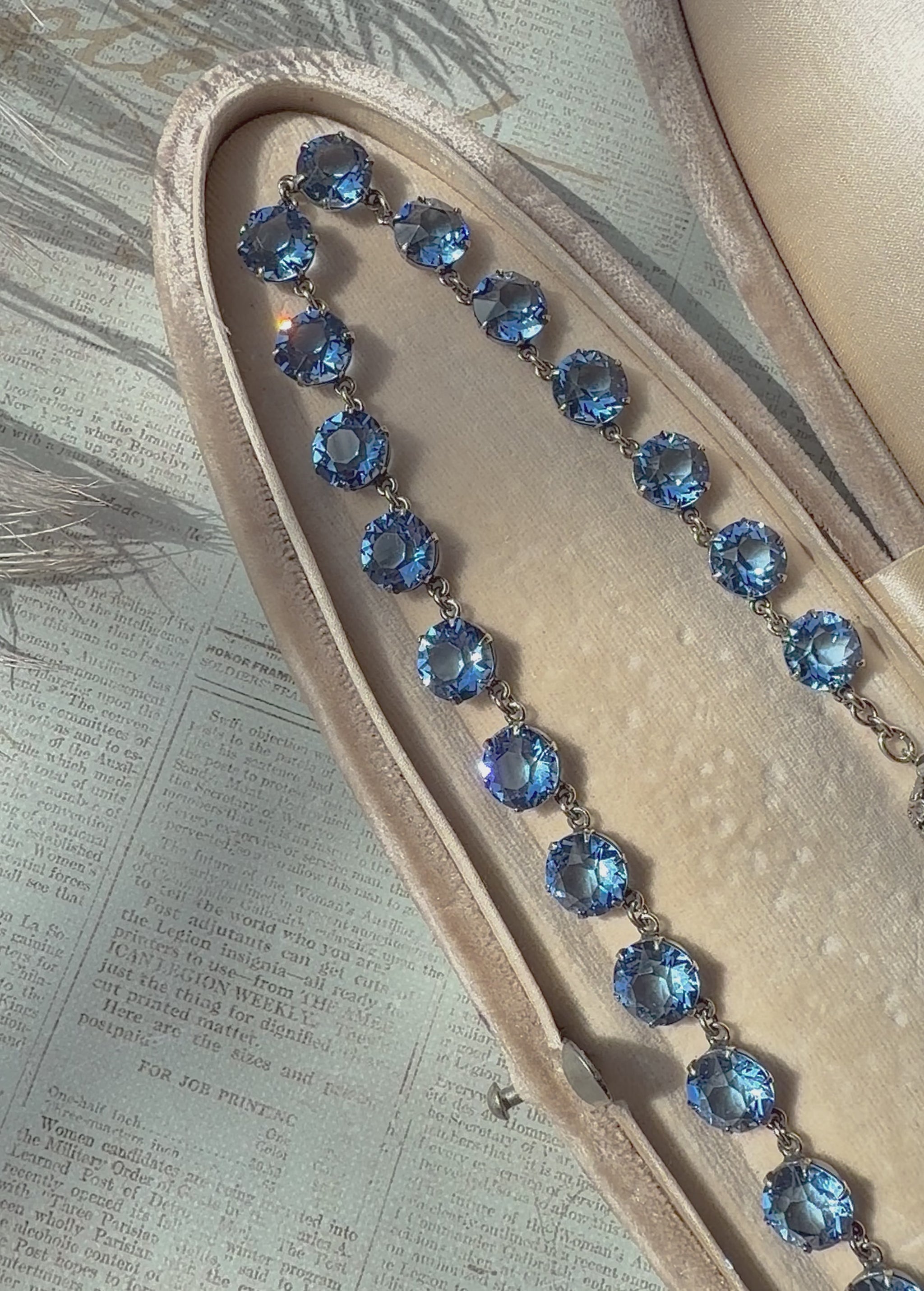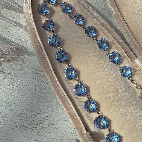 This phenomenal Art Deco era Rivière necklace is expertly crafted from Sterling Silver and set with the most beautiful true blue sapphire hued paste stones. As many of you have seen in the past, I’m extremely selective when it comes to sourcing these Art Deco pieces, bringing you only the best I can find and this gorgeous necklace is no exception - just look at that refraction SPARKLE in the videos!!! Finished with a stunning decorative clasp set with a rectangular cut paste stone giving it just the perfect balance and contrast. The clasp can be worn in the front, to the side or in the back giving you a variety of options!!!