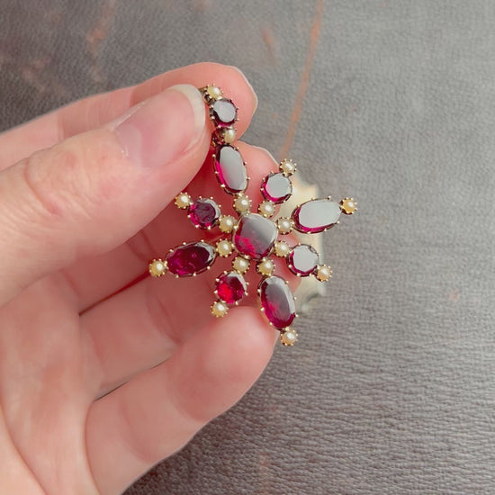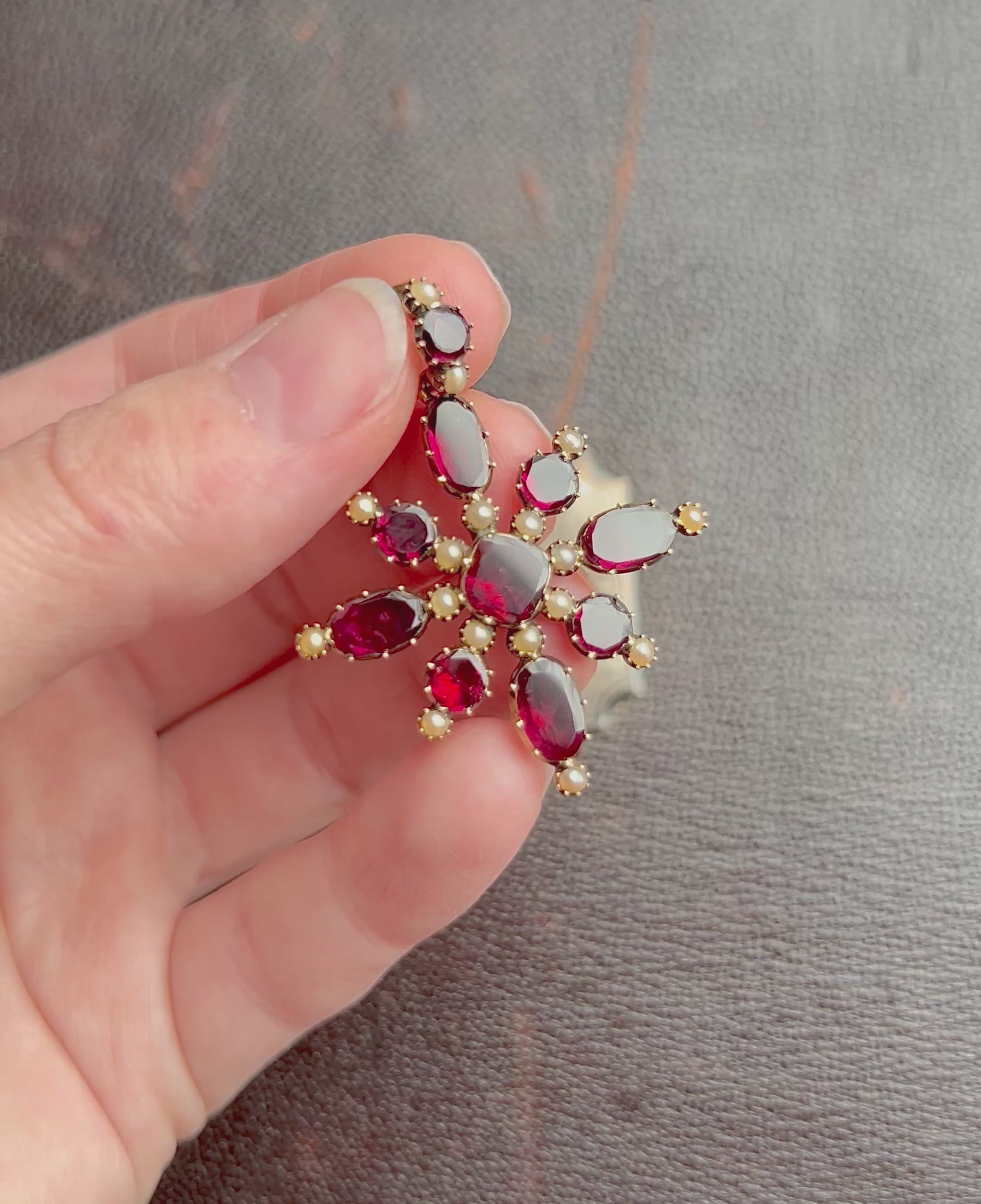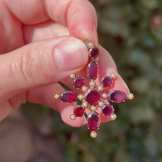 ANTIQUE • Georgian 14k Yellow Gold Foiled Garnet & Seed Pearl Cruciform Pendant