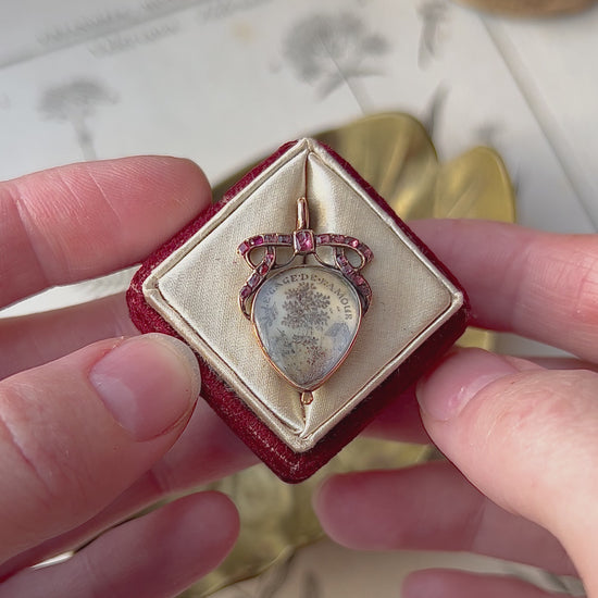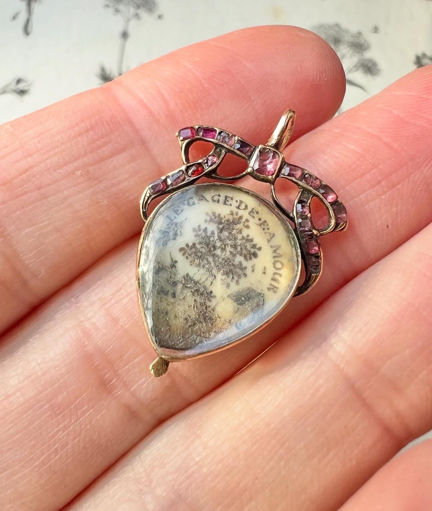 Crafted from rosy yellow gold (XRF tested in multiple places between 9ct-18ct) this 18th century Georgian heart shaped Amatory pendant is gem-set with beautiful old flat-cut Almandine Garnets in the most stunning variety of red and pink hues. With incredibly intricate macerated hair paintings on either side of an Ivory wafer showing romantic scenes of trees, a house and windmill. The motto at the top reads “Le Gage De L’Amour” which translates from French to “The Pledge of Love” under a pieces of polished crystal on both the front and back.