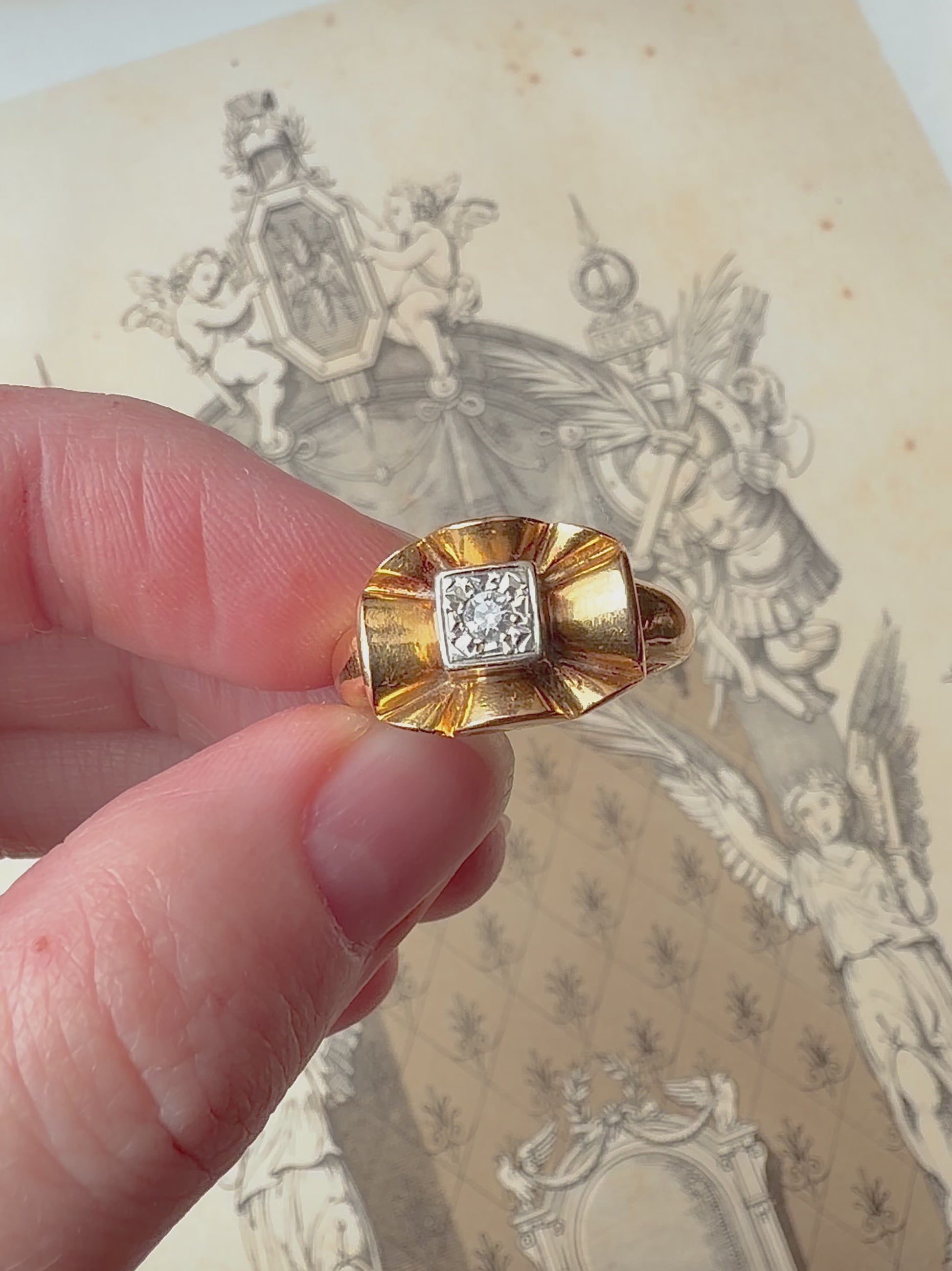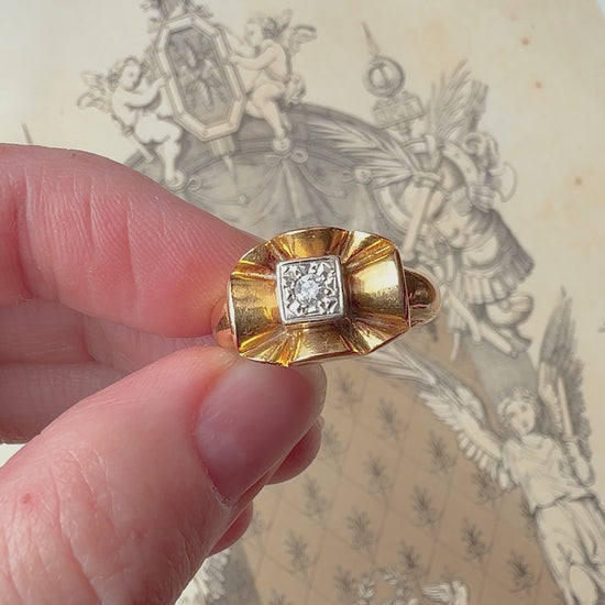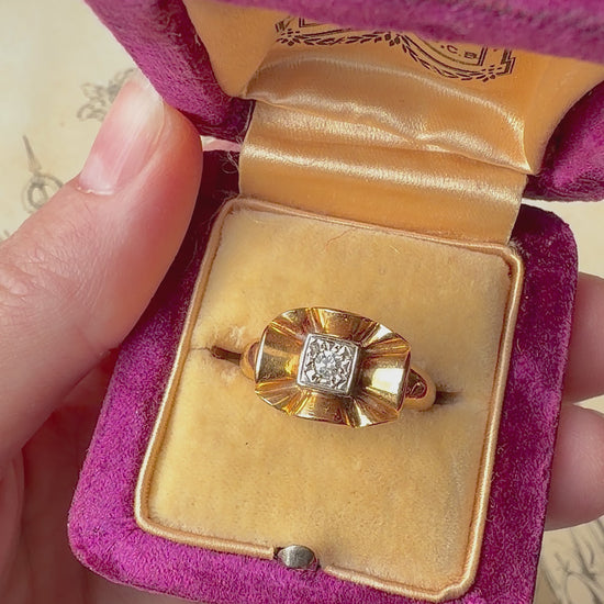 ANTIQUE • Mid-Century 18k Two Tone Gold w/ Transitional Cut Diamond Bow Ring