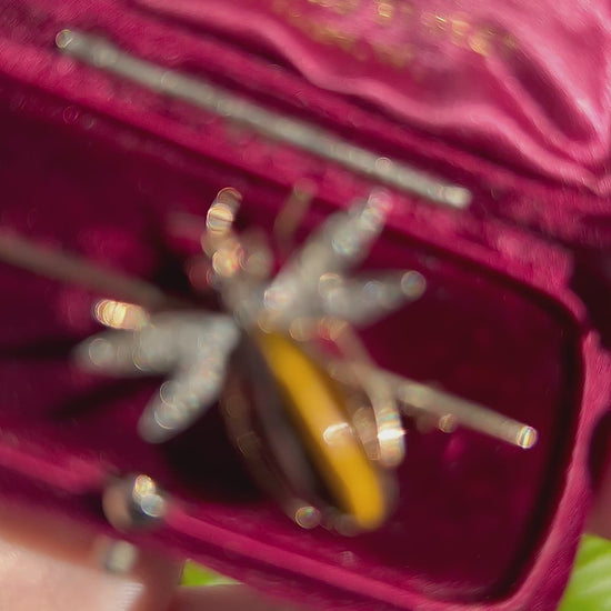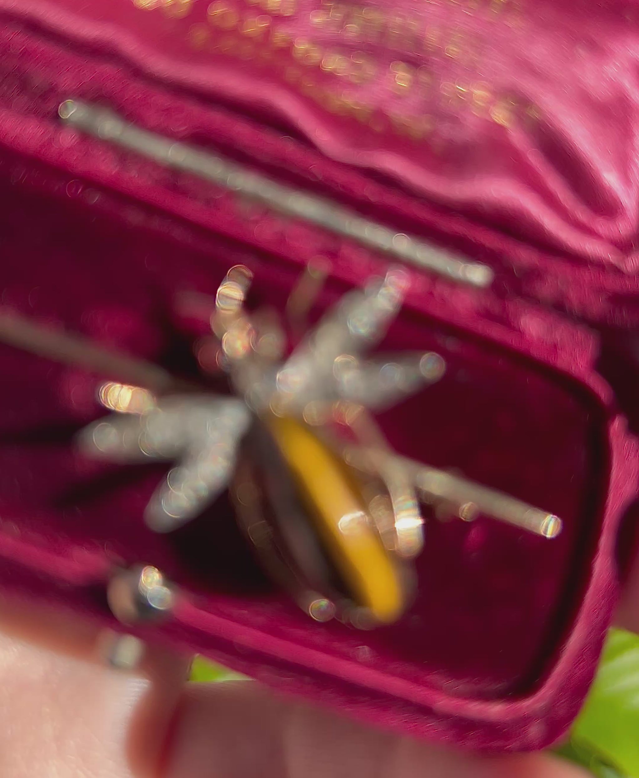 Flying high with another antique treasure from our jewelry garden… This piece is a beautiful antique Victorian flying insect brooch crafted from 9ct yellow gold (wings are silver-topped gold) set with Tiger’s Eye cabochons, Rose Cut Diamond wings and two small Garnet cabochons for eyes. Measuring 24mm x 48mm, he’s the ideal size for a jacket lapel or dress collar.