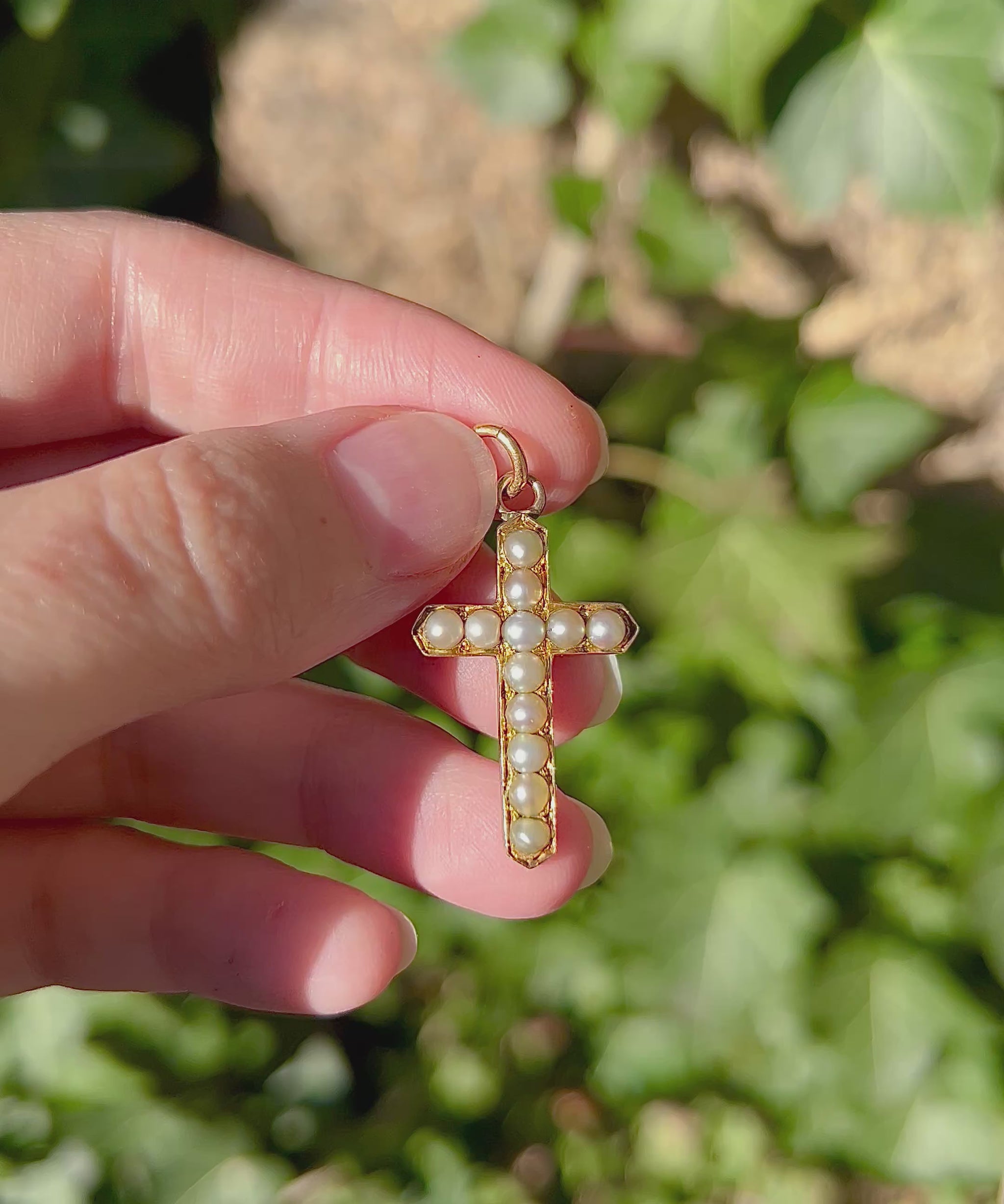 Crafted from warm 9ct yellow gold, this charming cross pendant is set with 12 lustrous saltwater pearls that exude an aura of divine feminine energy. She’s in wonderful condition for her age with no wear to the nacre of the pearls and measures 18mm x 28mm with a total weight of 2.1 grams. I love the tapered ends at each of the 4 points of the cross - it’s such a small detail but really elevates the overall design.