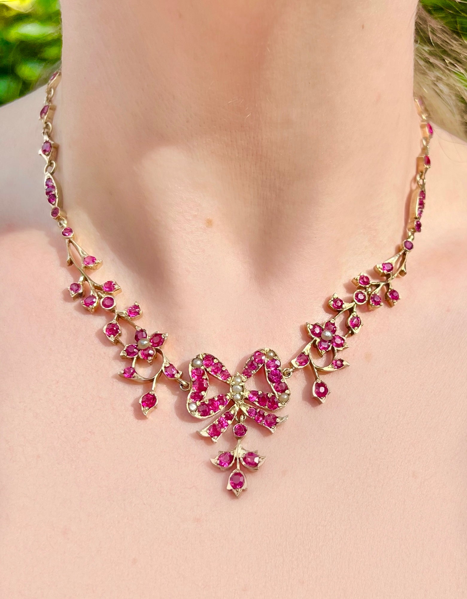 Antique Victorian necklace made in England circa 1890 is set with natural rubies and pearls crafted in beautiful yellow gold washed silver and finished with a slide barrel clasp. These rubies absolutely SING in the sunshine and have the most vibrant deep pink hues. This floral and bow motif piece sits perfectly on the collar at 16" in total length and is constructed with flawless craftsmanship.