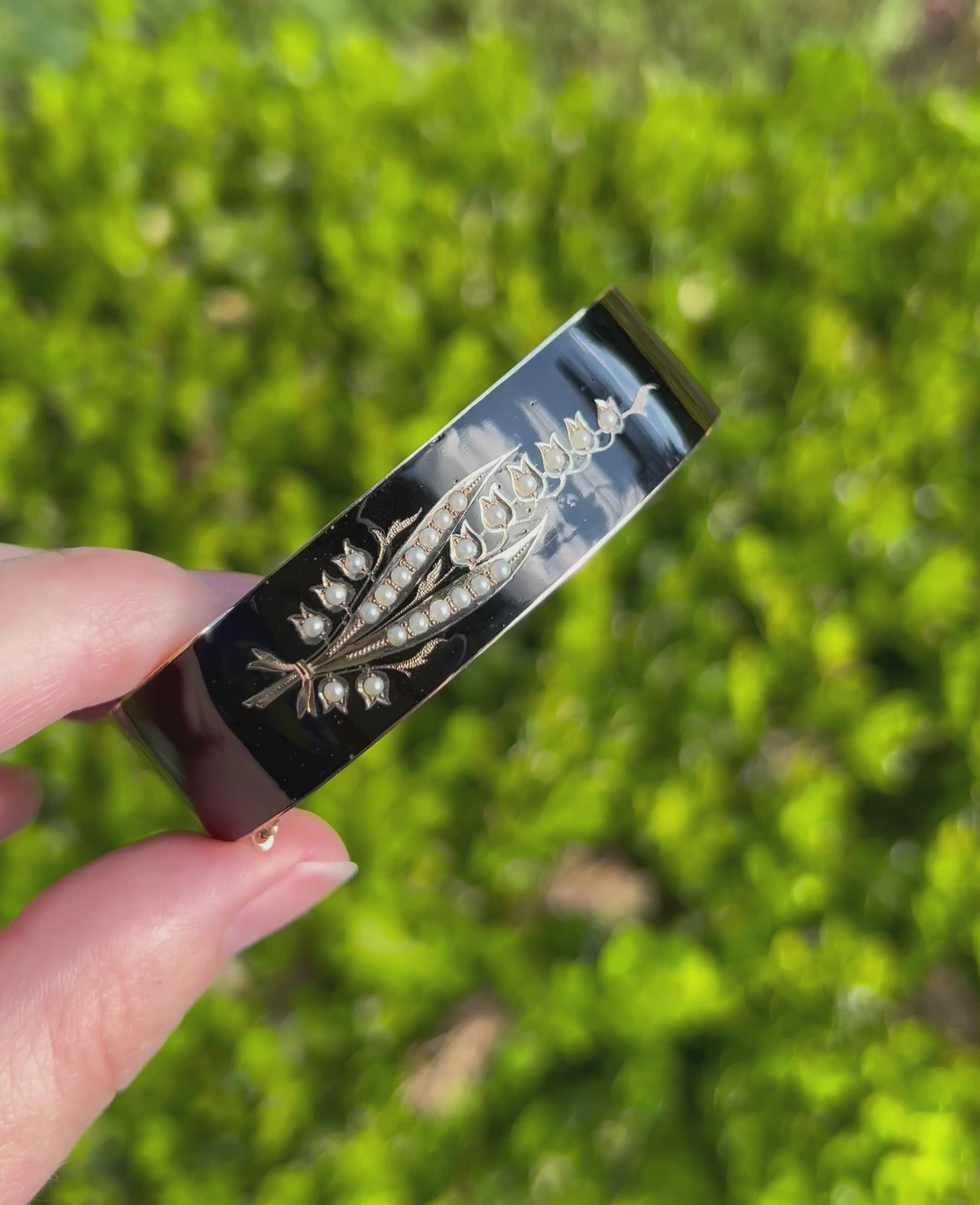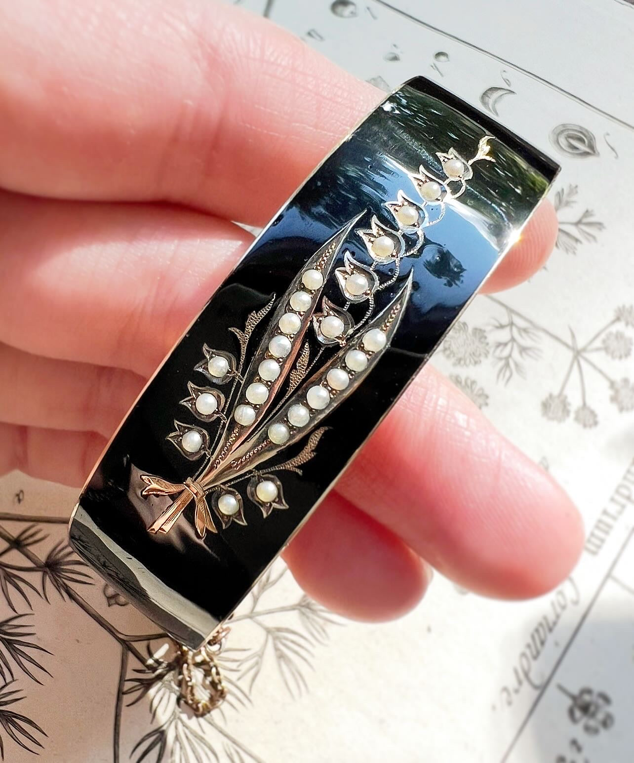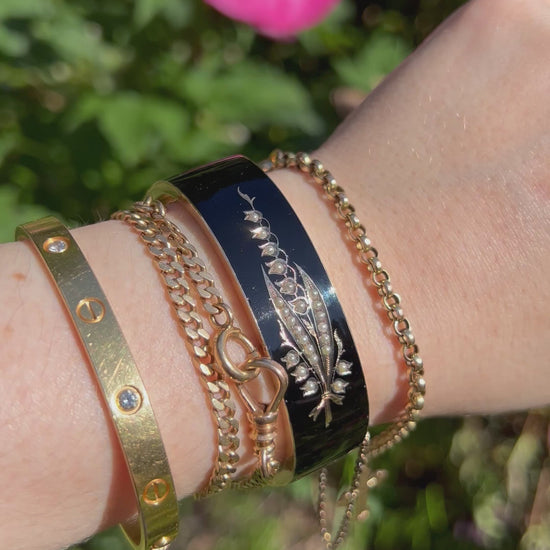 Crafted from beautiful 10k yellow gold and adorned with seed pearls set in a Lily of the Valley motif design on the front and geometric Taille d’Epargné enamel sides at the hinge & clasp. If you’re looking to up your wrist-game then this baby will sure make a statement of style!!! These are so rare to find in such FLAWLESS condition and even more rare that she’s not under 6” in size. The enamel is virtually perfect with only one small chip on the back side. The clasp is tight and extra secure with a safety chain. The interior has a few small dents but nothing that takes away from the gorgeous glossy enamel finish and sleek exterior design.