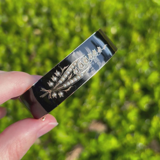 ANTIQUE • Victorian 10k Yellow Gold w/ Enamel & Seed Pearls Mourning Cuff Bracelet